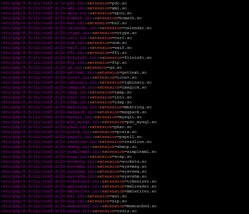 root@server:~# grep ‘^extension’ /etc/php/8.3/cli/php.ini /etc/php/8.3/cli/conf.d/*