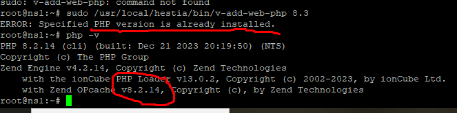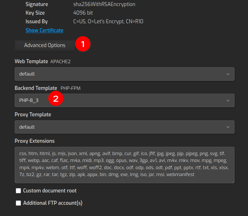 If php 8.3 is already installed, edit the web domain and in Advanced options select PHP-8_3 as backend template, once done, click on button Save