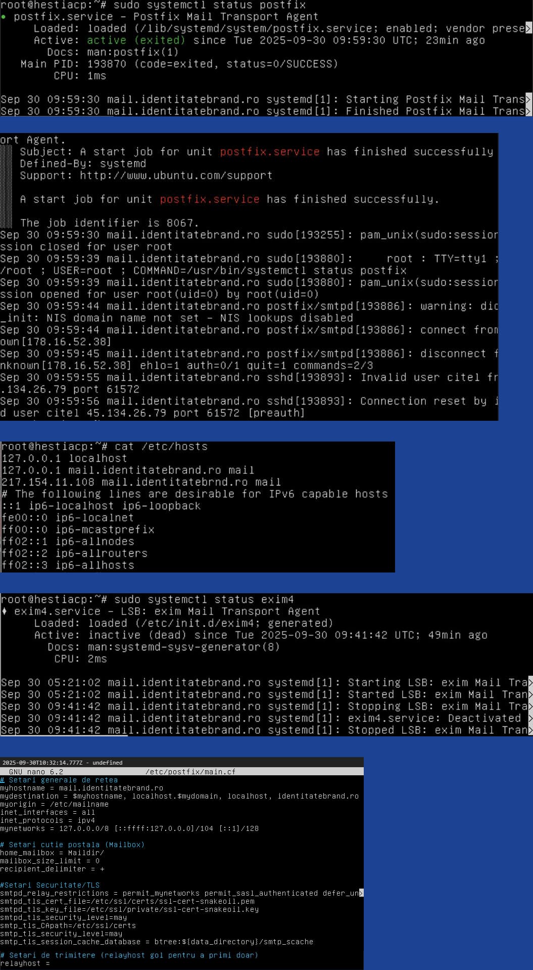 I am facing a critical issue where my Postfix MTA is failing to start and remains consistently in an Active: active (exited) state, blocking all incoming mail for the domain https://identitatebrand.ro. This issue started after an attempt to set up SendGrid, which I have since completely reverted and cleaned up.