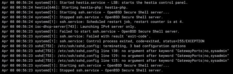 The GatewayPorts|no,sysadmin entry causes the SSH server to fail to start.