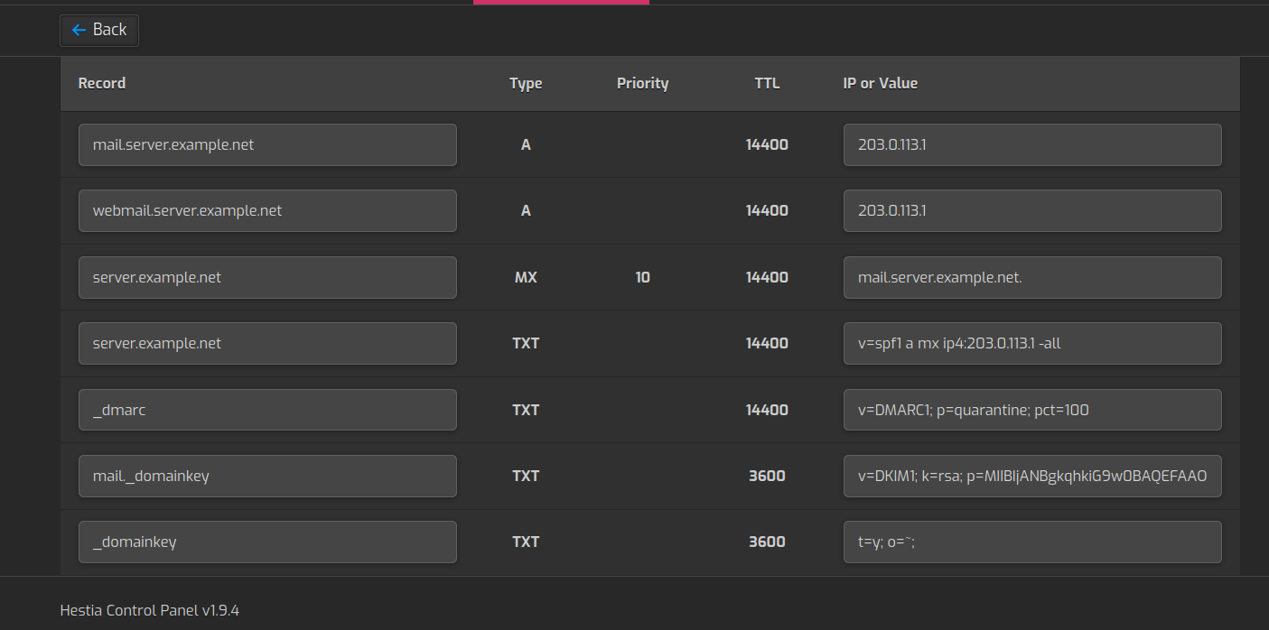 Once you create a mail domain for server.example.net in Hestia, you can see the DNS records that need to be created.