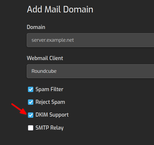 For example, when you add the mail domain server.example.net (remember to enable DKIM support):